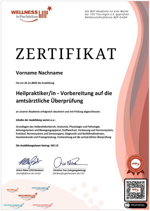 Sie können die Heilpraktiker/in Ausbildung jederzeit beginnen! Der Kurs kann in mindestens 10 Tagen absolviert werden, wobei Sie bis zu 12 Monate Zeit haben. Wenn Sie alle Lektionen absolviert haben, können Sie sich für die Online Abschlussprüfung anmelden. Nach Bestehen der Abschlussprüfung beantragen Sie Ihre beiden Digital-Zertifikate (deutsch und englisch). Das Deutsche Zertifikat und das Englische Certificate (PWA - Professional Wellness Award) sind direkt als Download (PDFs) verfügbar und im Preis schon inkludiert. Für einmalige 49,95 EUR können die beiden dazugehörigen physischen Zertifikate auf echtem Kartondruck (signiert) erworben werden - diese werden dann direkt nach Zahlungseingang via DHL an Sie ausgeliefert.