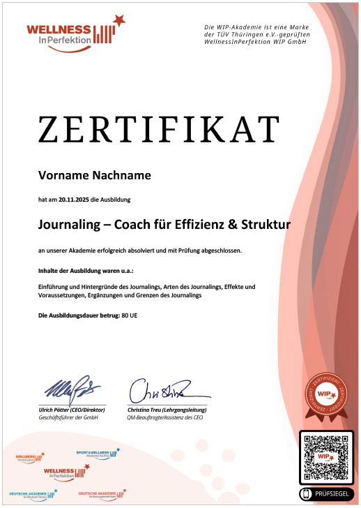 Starten Sie jetzt den Online-Kurs „Journaling – Coach für Effizienz & Struktur“ an der WIP Akademie – vollständig digital, flexibel und ohne Anreise. Direkt nach Ihrer Anmeldung erhalten Sie Ihren persönlichen Zugang zur Online-Akademie und können sofort mit den Lerninhalten beginnen.
